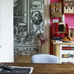 I know I can’t! There are some amazingly talented artists out there and this one is one of my favorites and the most original finds! I was flipping through the latest issue of Living Etc (March 09) and came across a spread called Sugar Candy, displaying Author India Knight’s family home. This mural was done by Charlotte Mann, all with a black marker pen! I’m so amazed at the detail and how beautiful it looks, this could be a really fabulous wallpaper, I know I would purchase it!Â