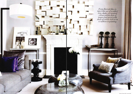 There is so much to look at in this next image.  The very graphic vintage squared mirror is so sexy, yet a conversation piece on it’s own.  Anchored at one end with a black base/white shade floor lamp and at the other with a lovely small table and gorgeous black candelabras.  Once again, grey furniture, light colored rug, white walls, sprinkled with hints of color in the pillows… just perfect.