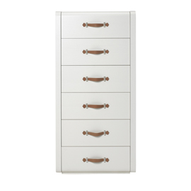 A vintage, colonial travel inspired design with thick aniline leather handles. Drawers are mounted on high quality self-close runners. Finished with a satin sheen lacquer in six neutral colours. Made in Italy.