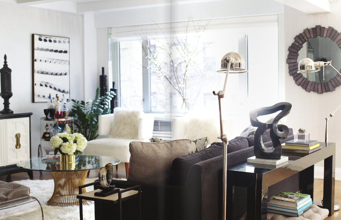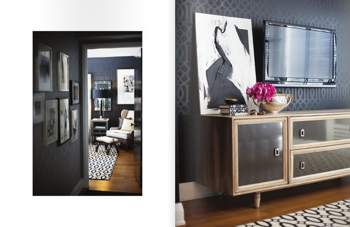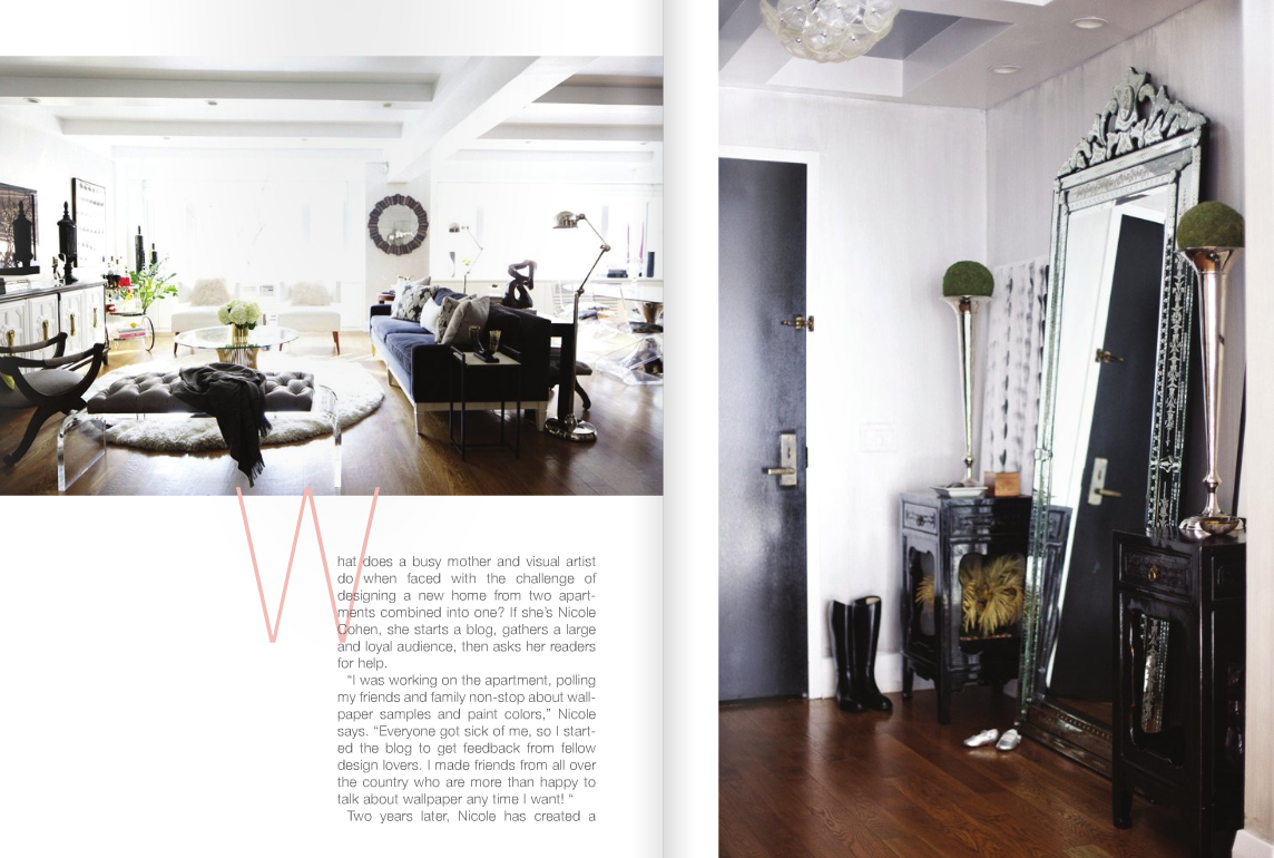 Now this was my favorite part, Nicole Cohen’s home is pretty much what I’d like to aim for more or less. The color of black, white, grey and hits of color is exactly my goal. Mind you I live in a rental with carpet {I know I know, I personally can’t stand it and dream of hard wood floors}, this is helping find a balance. I have mostly all dark wood/black furniture and I’m currently trying to lighten things up with art and accessories. It sure does take time though, finding all the right pieces etc. Anyways I digress, I am completely envious of her home, you’ve done a beautiful job Nicole! I’ll be printing these pages and keeping them for inspiration. I’m literally drooling (well not literally) over the black trellis wallpaper in the bedroom, modern glamour at it’s finest.